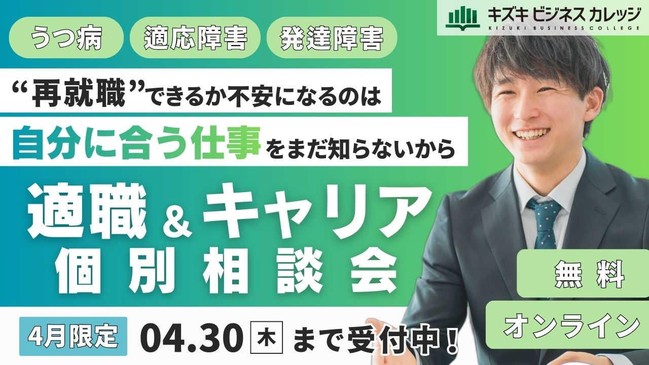 就労移行支援事業所・キズキビジネスカレッジ(KBC)が、仕事・働き方にお悩みのある方のために、無料のオンライン適職&キャリア個別相談会を期間限定で実施します。