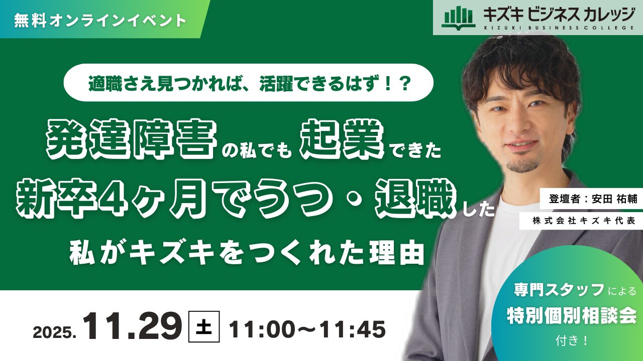 【11/29開催】適職さえ見つかれば、活躍できるはず!?〜発達障害の私でも起業できた〜新卒4ヶ月でうつ・退職した私がキズキをつくれた理由【無料/オンライン】